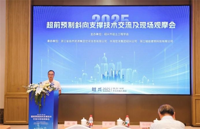 2025年9月26日下午,由绍兴市岩土工程学会主办,浙江省自然资源集团空间信息有限公司、中海宏洋绍兴公司、浙江瑞岩建筑科技有限公司共同承办的“超前预制斜向支撑技术交流及现场观摩会”在绍兴顺利召开。绍兴市住房和城乡建设局工程处处长庞亮,原市建管局副局长张煜,绍兴市柯桥区质监站胡立锋,俄罗斯自然科学院外籍院士、工程地质专家、岩石力学专家、绍兴文理学院教授伍法权等政府部门、行业专家、企业代表等参会,共同探讨最新工程技术应用。中海宏洋绍兴公司助理总经理蔡辉参加会议。