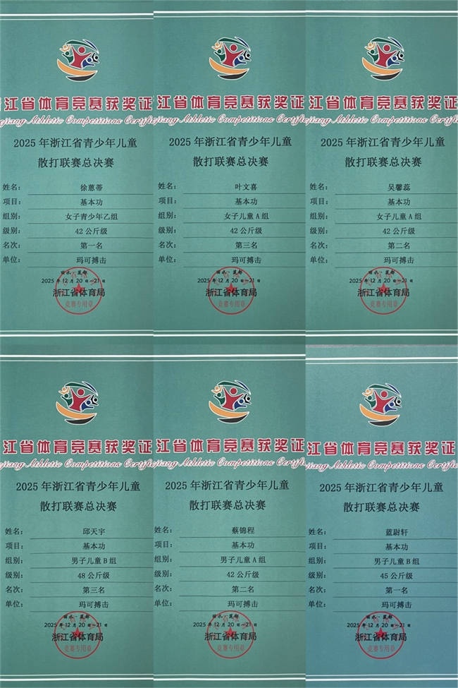 此外,蔡锦程、吴馨蕊分别获得男子儿童A组42公斤级、女子儿童A组42公斤级银牌;邱天宇与获评“优秀运动员”的叶文喜,分别拿下男子儿童B组48公斤级、女子儿童A组42公斤级铜牌,每一份荣誉都凝聚着汗水与坚持。值得一提的是,运动员赖安澜作为全体运动员代表登台宣誓,展现了青少年武者的责任与担当;教练员侯豫闽凭借专业的指导与付出,被浙江省体育局授予“优秀教练员”称号,师徒同心共创佳绩,成为赛场内外的佳话。